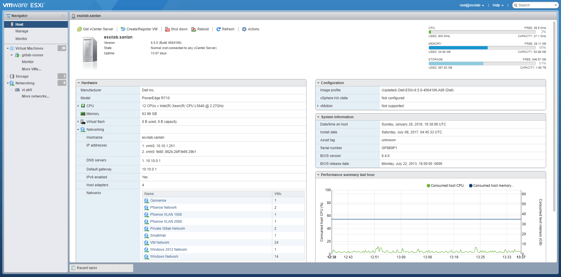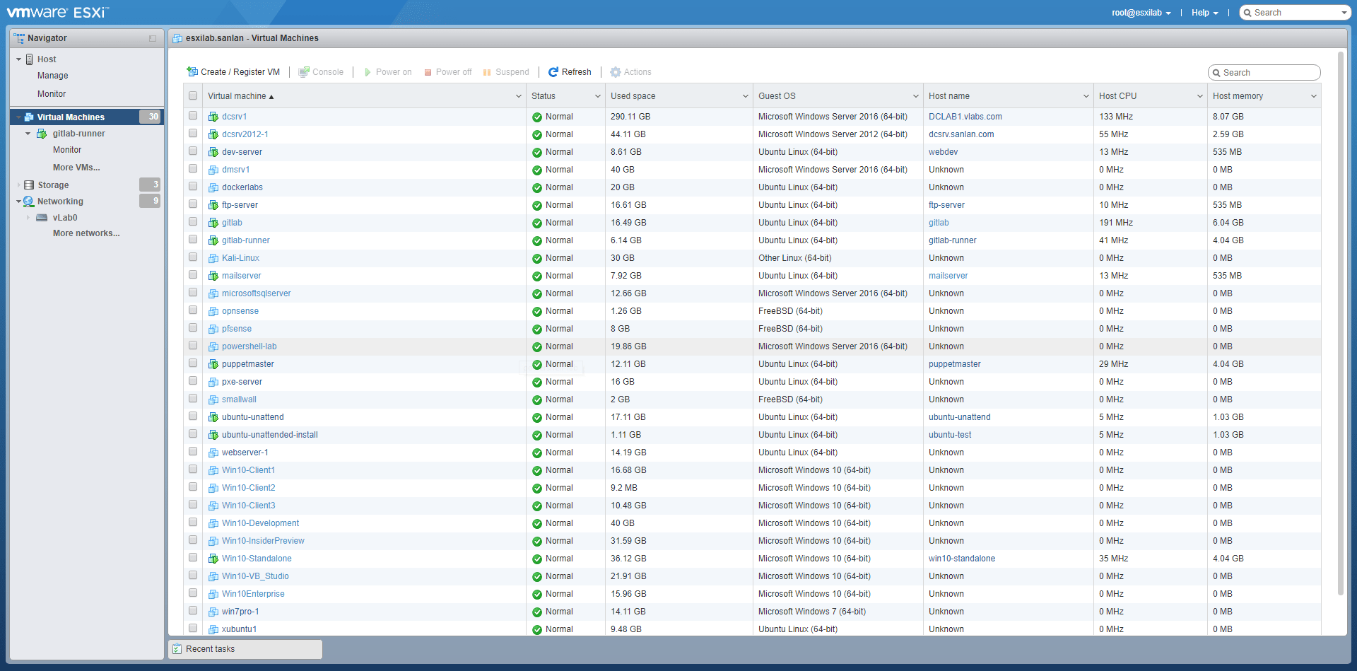 It still runs Vmware ESXI 6.5 and currently has 30 registered VMs. This number fluctuates as I create and delete VMs.